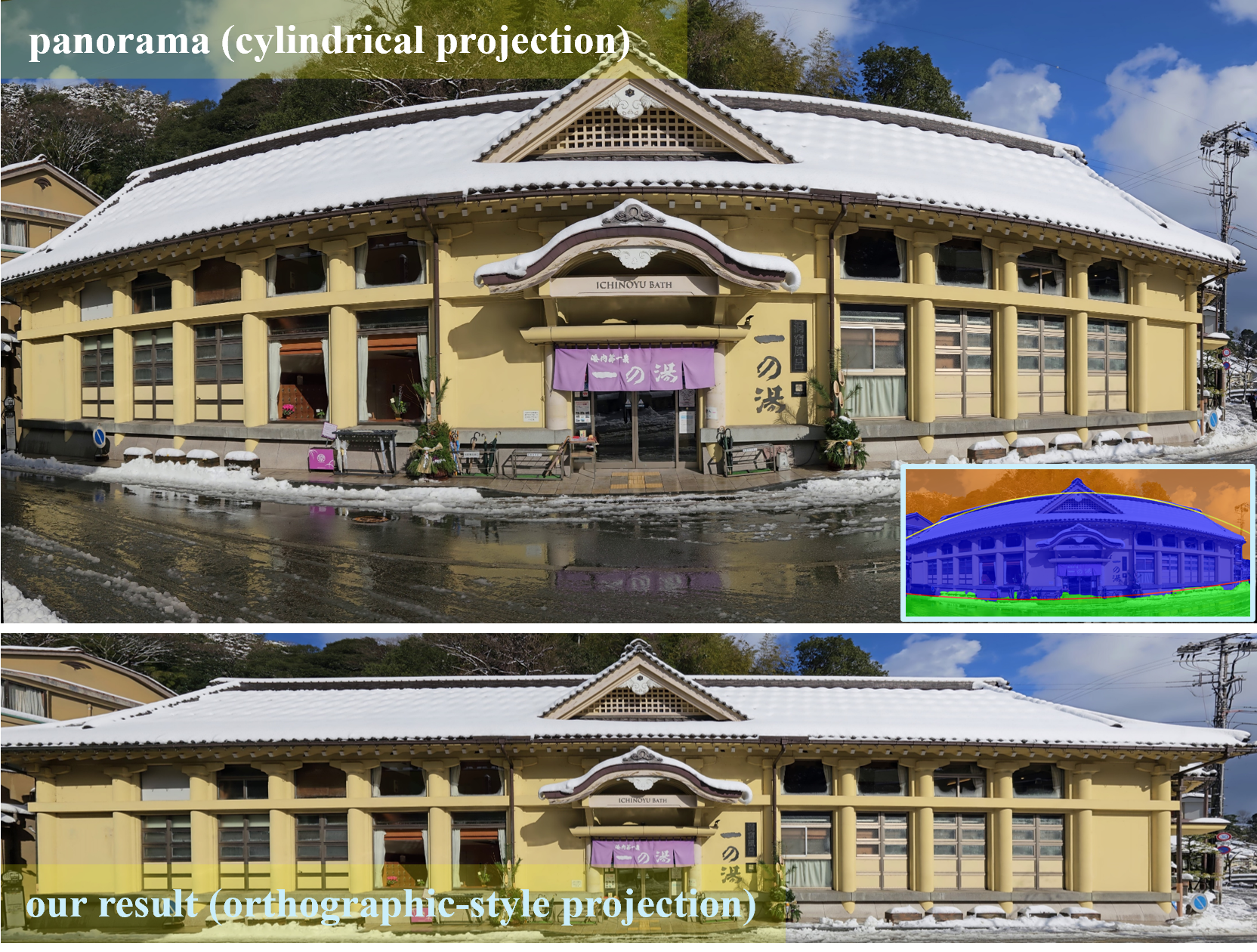 Photographing architecturally expansive structures presents significant challenges due to the limited field of view inherent to standard imaging systems. Traditional solutions, including the use of wide-angle optics or panoramic stitching techniques, frequently introduce significant geometric distortions that compromise the fidelity of architectural forms. To address this limitation, we introduce a novel framework for synthesizing orthographic-style projections of elongated buildings, with an emphasis on structural preservation. The proposed method leverages a neural semantic segmentation network to autonomously identify architectural components and foreground elements within a panoramic image. Geometric rectification is performed via a forward mapping algorithm, derived from extracted boundary contours and vanishing point estimations, and is complemented by an inpainting stage to recover missing regions. Empirical evaluations confirm that our pipeline maintains architectural accuracy more effectively than conventional techniques, while offering an accessible and streamlined image acquisition process.