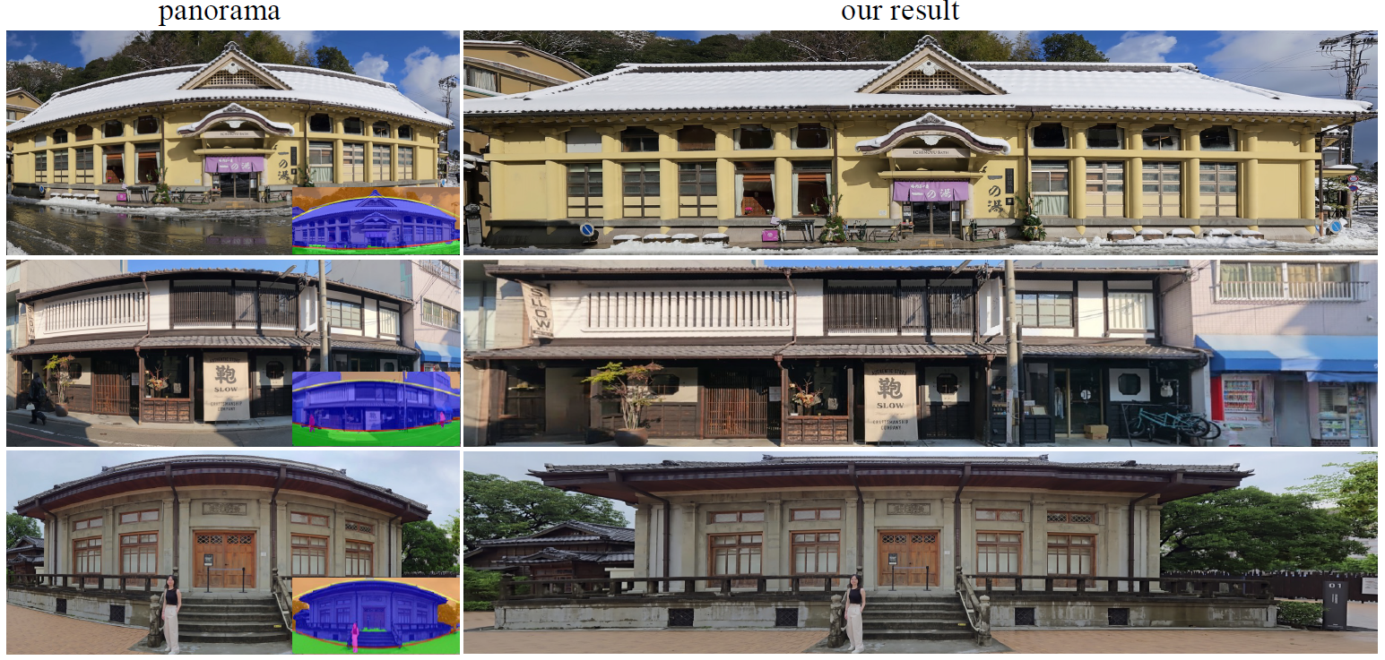 Results of our orthographic-style projection are shown. The left column presents the original panoramas, which exhibit distortion caused by cylindrical projection. In contrast, the right column displays our results, which more accurately preserve structural integrity and present the scene in a way that closely resembles human visual perception.
