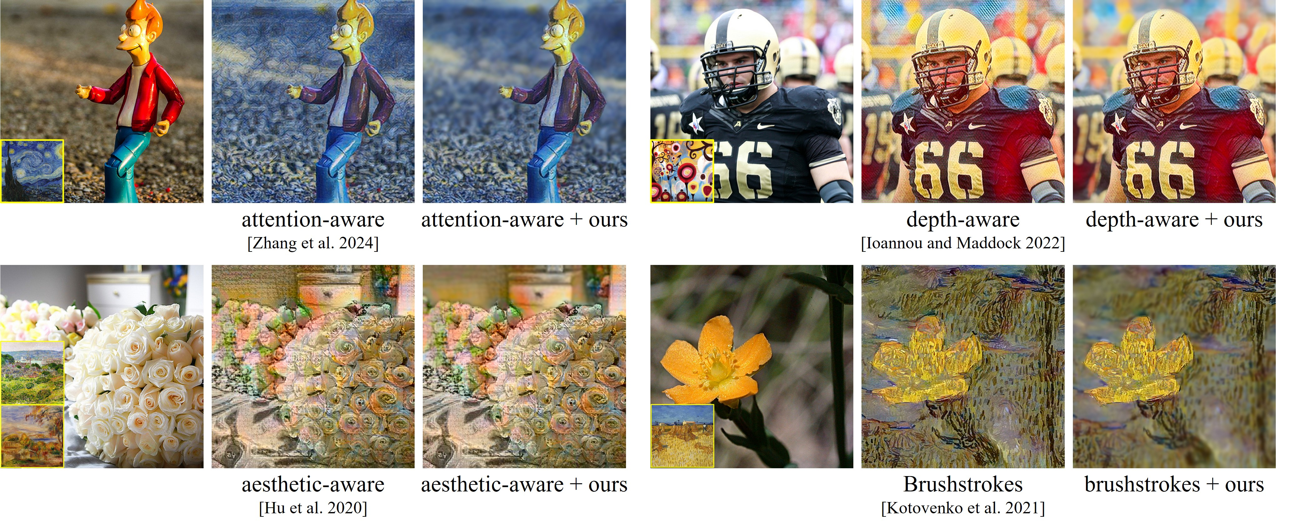 By integrating our method with existing style transfer techniques, including attention-aware [Zhang et al. 2024], depth-aware [Ioannou and Maddock 2022], aesthetic-aware [Hu et al. 2020], and parameterized brushstrokes-based [Kotovenko et al. 2021] methods, we effectively preserve the original defocus effects intended by the photographer. The incorporation of defocus into the stylized outputs further enhances structural coherence, allowing the background to fade naturally and improving visual separation and emphasis on focal regions. For each method, the corresponding content and style images are presented in the first column.